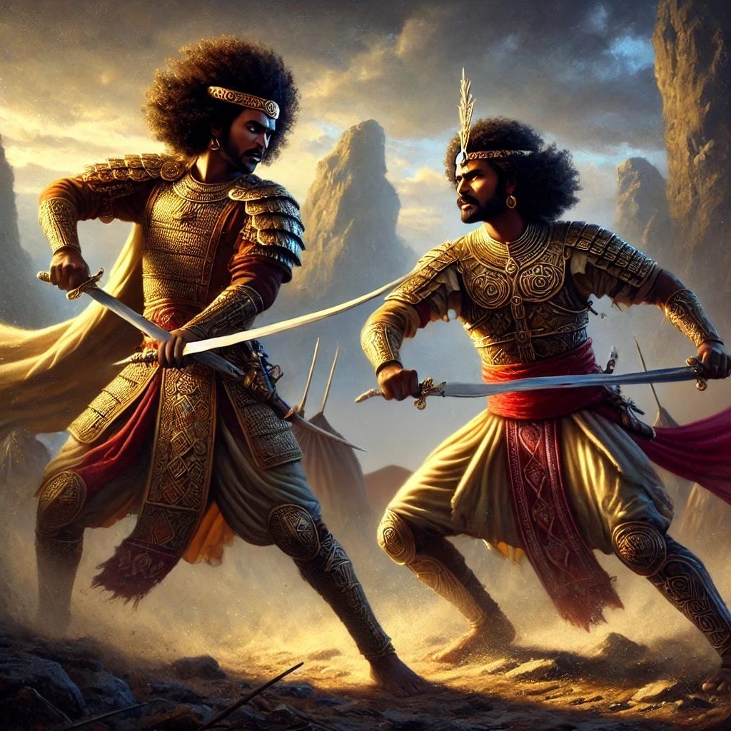 Prince Ariat likely viewed the impending confrontation with Abraha as a solemn and fateful moment. He understood that if a battle were to commence, it would pit two Aksumite forces against each other—composed of fellow Habesha brothers. There was no need for such bloodshed. Ariat believed that a duel between the two ambitious princes could resolve the matter of succession without unnecessary loss of life of their troops & civilians caught in the crossfire. Confident in his physical superiority, Ariat, who was taller and stronger than Abraha, felt assured of victory.
