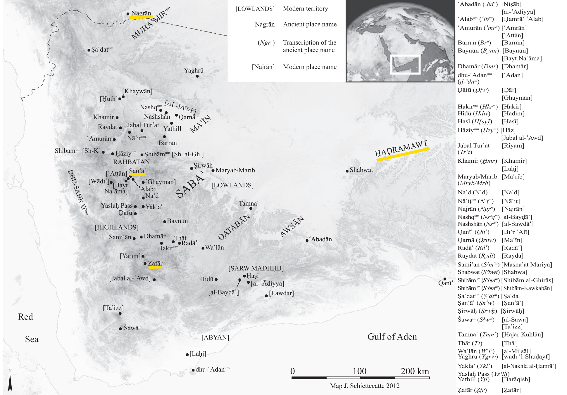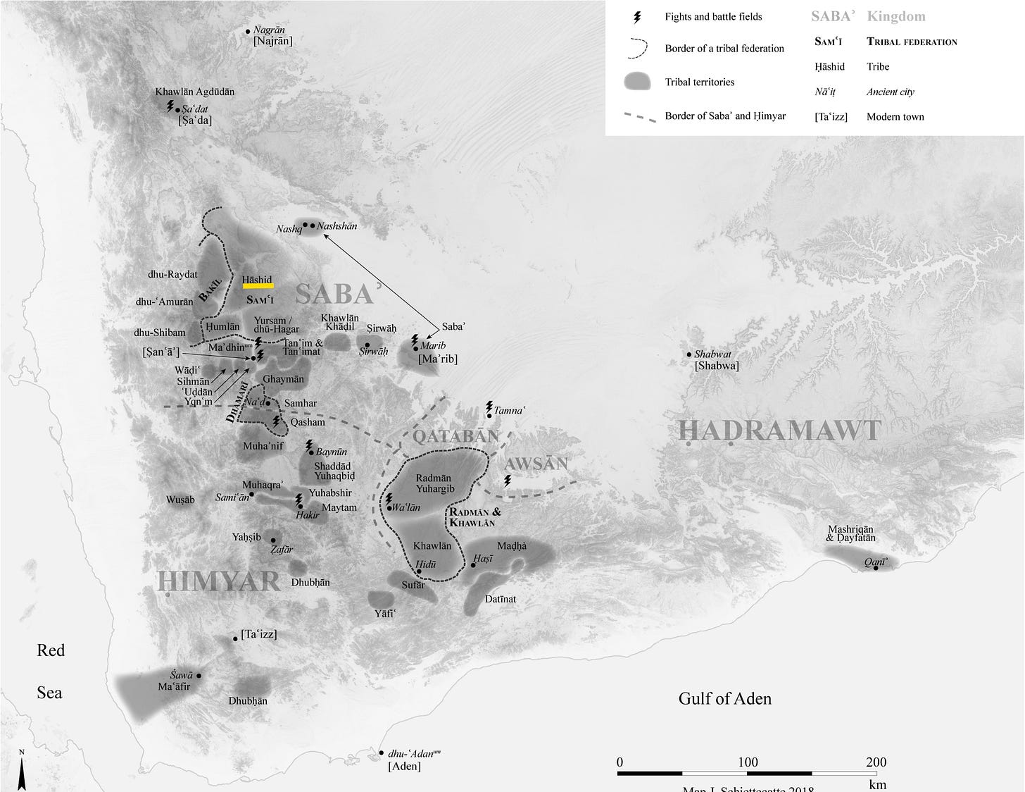 Yemen, before the Kingdom of Himyar (<~300AD). Source: Arabs and Empires Before Islam, pg 95. Pay close attention to the cities of Najrān, Ẓafār, Ṣanʿāʾ & the region of Ḥaḍramawt.