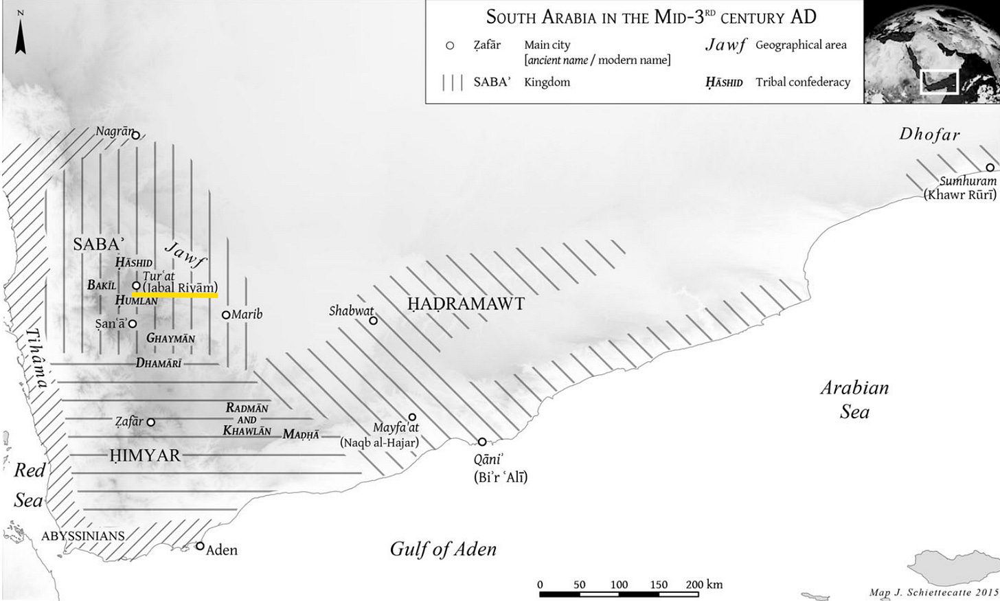 Jabal Riyam, the location where these inscriptions were found, is highlighted. Source: The political map of Arabia and the Middle East in the third century AD revealed by a Sabaean inscription, pg 177.