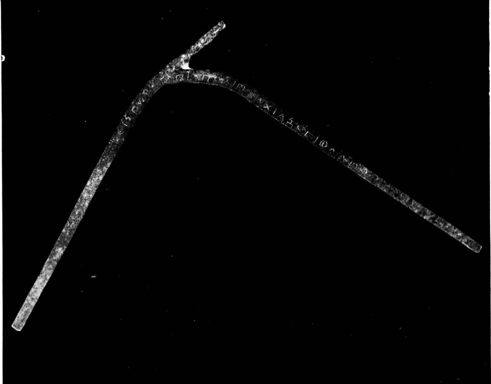 In 1953–54, at Addi Gelemo in eastern Tigray, a bronze sceptre-like object, measuring 55 cm and weighing 455 grams, was discovered10. The piece bears an inscription in unvocalised proto-Geʿez that mentions a king of Aksum named GDR.