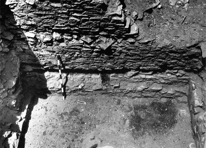A second building phase followed, during which a new structure was erected directly over the ruins of the first. This later construction employed different walling techniques, possibly including the ‘monkey head’ method, a style common in the Aksumite Era that used timber framing combined with rubble stones and mud mortar. Stratigraphic (analysis of rock layers) test pits at the base of the podium also revealed evidence of occupation that predated the construction of the original building25.